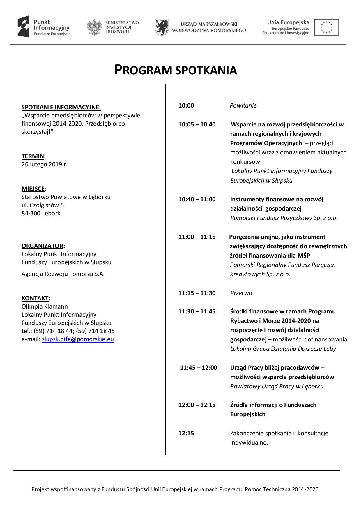 Warunkiem uczestnictwa w spotkaniu jest przesłanie do dnia 25 lutego 2019 r. wypełnionego formularza zgłoszeniowego na adres: slupsk.pife@pomorskie.eu lub zgłoszenie telefoniczne pod numerem: 59 714 18 44 lub 59 714 18 45. Otrzymanie potwierdzenia przyjęcia zgłoszenia jest równoznaczne z wpisaniem na listę uczestników spotkania.